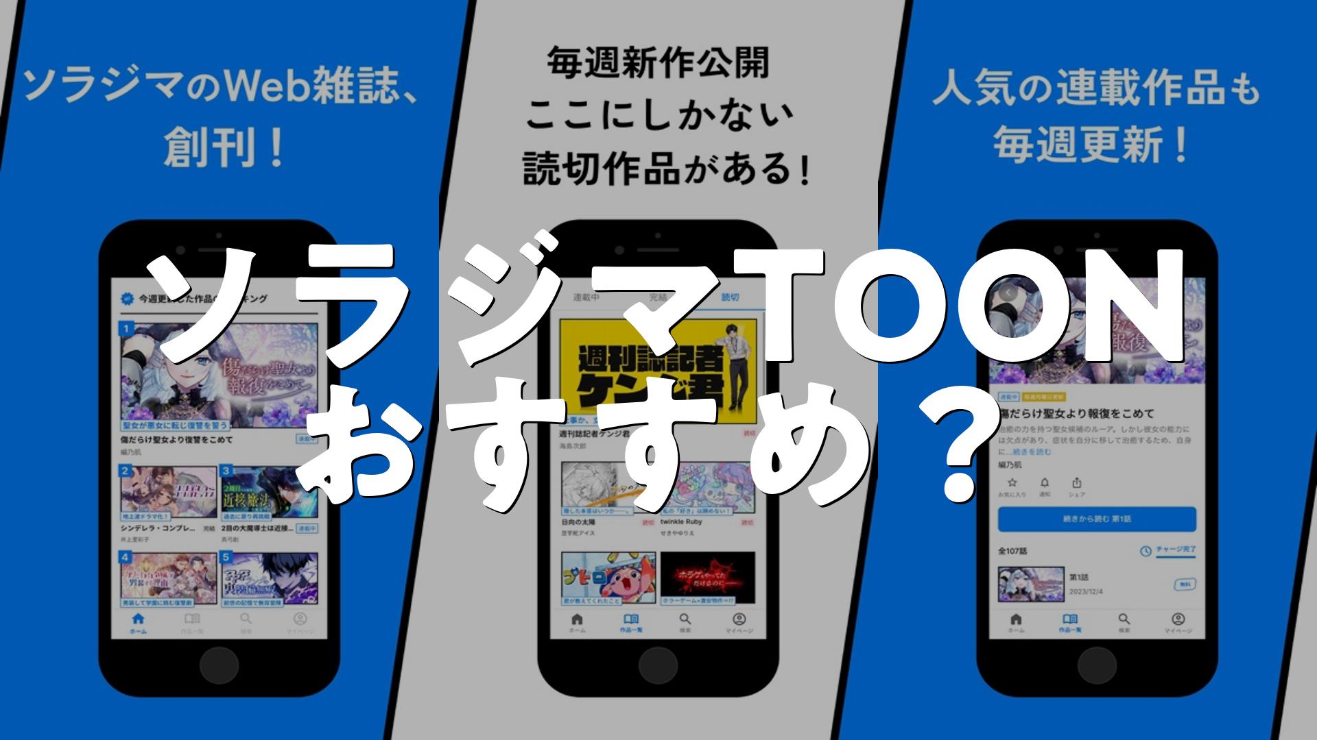ソラジマTOONは「無料でいろんな縦読み漫画に出会える」ことが魅力。読切が多く新作に触れやすい点や更新頻度の高さが好評です。改善点はあるものの、気軽に試して自分の好きな作品を見つけたい人にはまずおすすめできるアプリです。