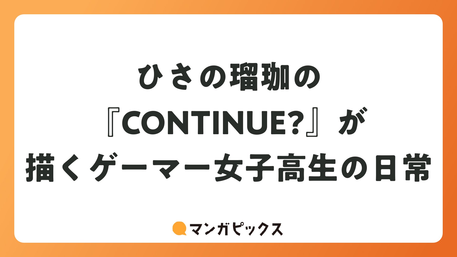 ひさの瑠珈の『CONTINUE?』は、ゲーマー女子高生の日常をポジティブに描いた永遠の名作。ゲームの興奮と友情の温かさが融合し、読む人を元気づけます。マンガファン必読の1冊です!