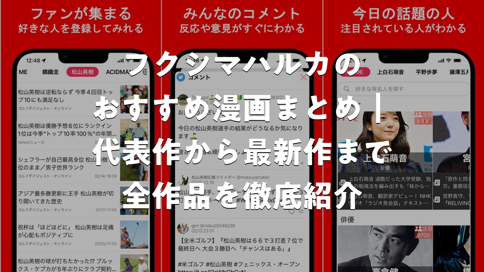 フクシマハルカの最新ニュースやマンガ関連の情報をいち早くキャッチしたい方には、「ファンニュース」というアプリも便利です。このアプリは話題の人や自分の好きな人に着目してニュースを読めるアプリで、ニュースカテゴリに対応しています。